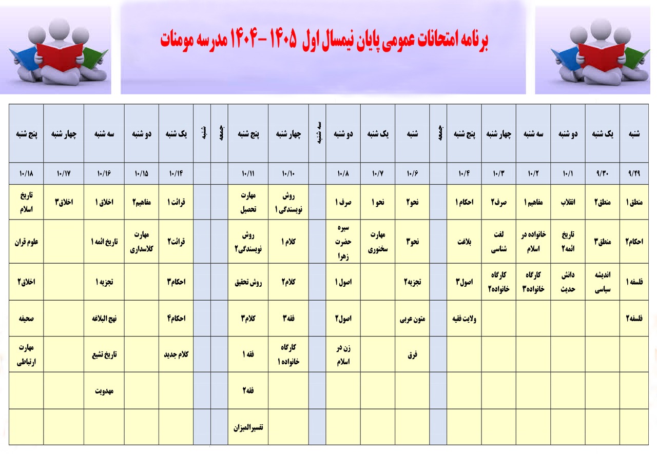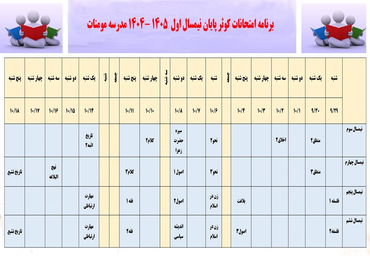 2018/10/07 21865 Hits 0 Comment برنامه امتحانات برنامه امتحانات نیمسال اول 1405-1404 مدرسه / دانشگاه نمونه برای مشاهده و دانلود برنامه امتحانات بر روی تصاویر زیر کلیک کنید. برنامه امتحانات - قسمت اول برنامه امتحانات - قسمت دوم برنامه امتحانات - قسمت سوم برنامه امتحانات - قسمت چهارم برنامه امتحانات - قسمت پنجم برنامه امتحانات - قسمت ششم