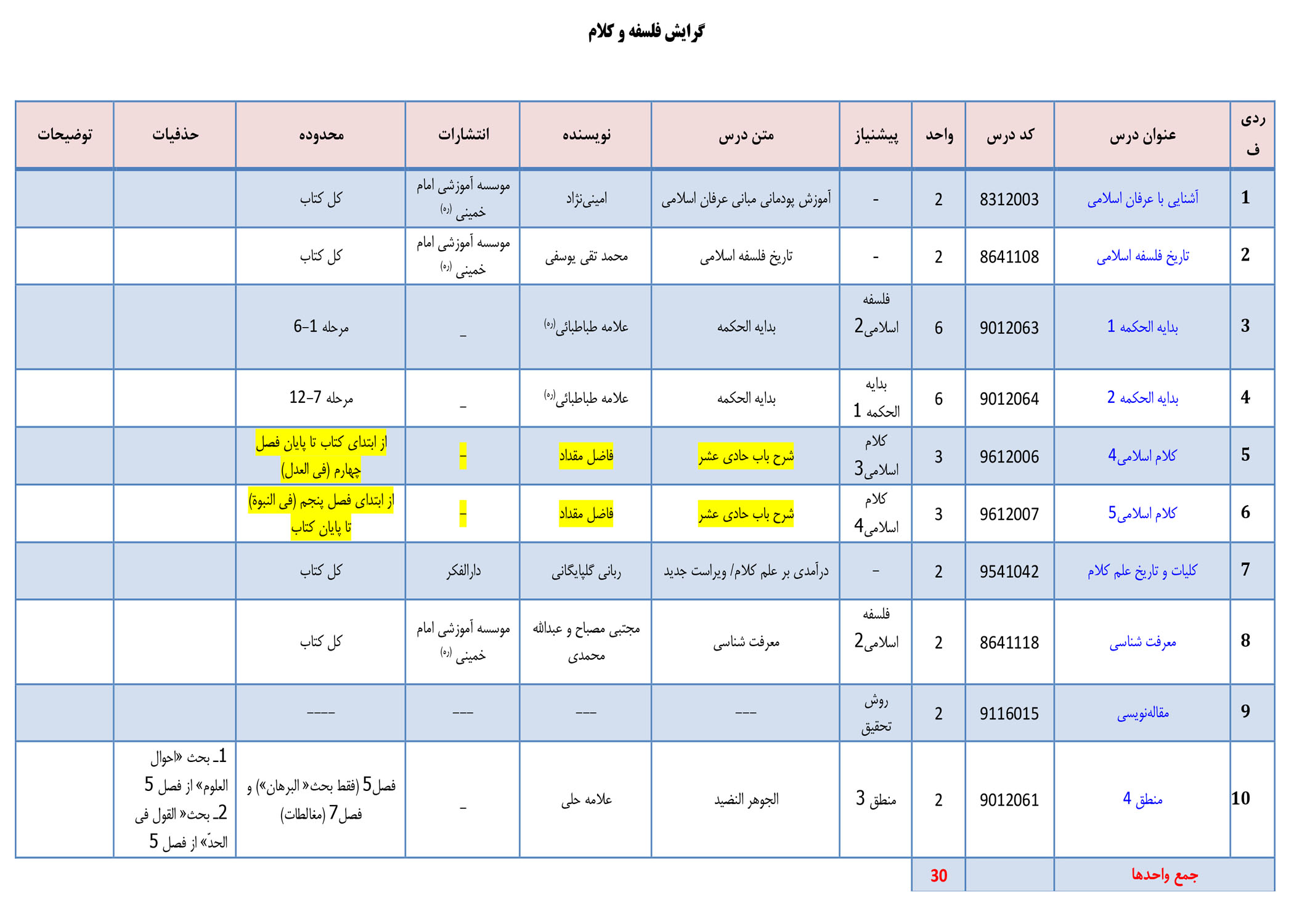 عناوین درس ها و متون درسی عمومی و گرایشی