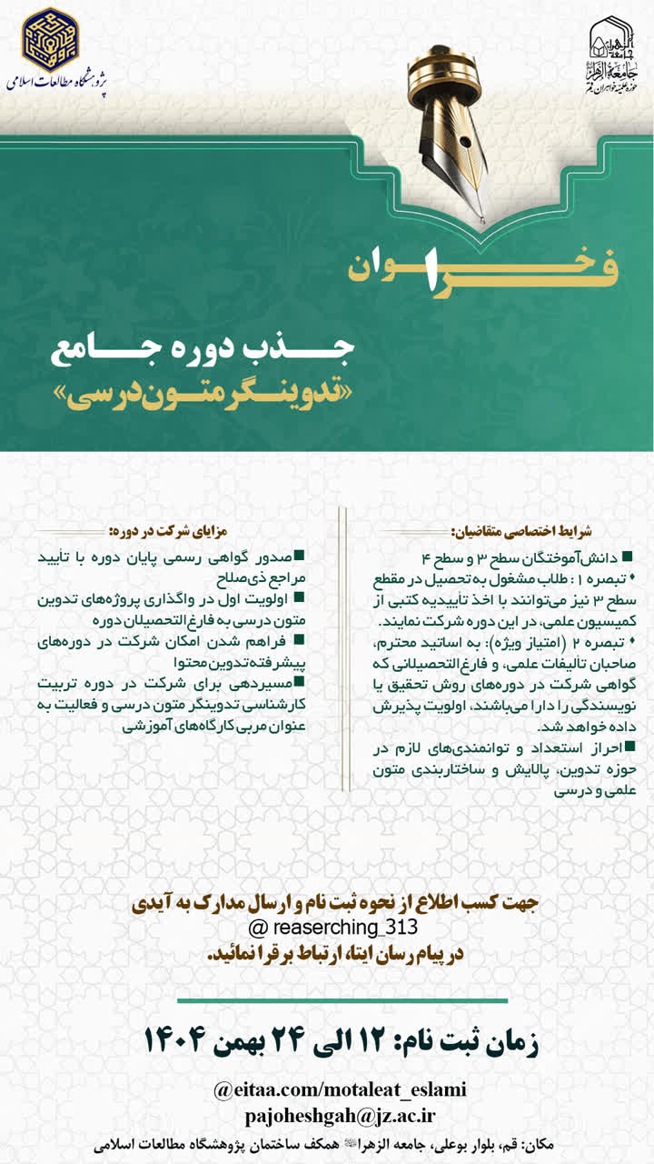 پژوهشگاه مطالعات اسلامی با هدف تقویت توان نگارش علمی و آموزشی دانش پژوهان، فراخوان دوره جامع تدوینگر متون درسی را منتشر کرد.